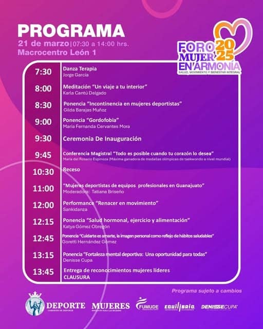 Por su coincidencia con el inicio de la primavera, 21 de marzo, las actividades arrancarán con sesiones de danza terapia y meditación. Los temas de las conferencias estarán relacionados con el bienestar de la mujer y el deporte como: incontinencia en mujeres deportistas, “gordofobia”, salud hormonal, ejercicio, alimentación, imagen personal y fortaleza mental.